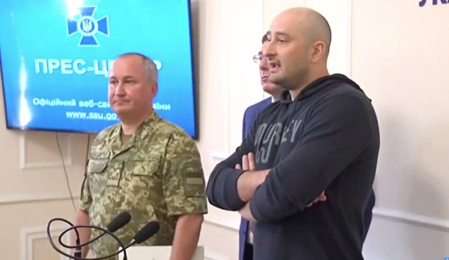 Увечері 29 травня стало відомо про нібито розстріл російського журналіста Аркадія Бабаченка на порозі його квартири у Києві. А ввечері 30 травня голова СБУ Василь Грицак заявив, що Бабченко живий: «вбивство» інсценувала його спецслужба, аби попередити справжнє вбивство і затримати замовника.