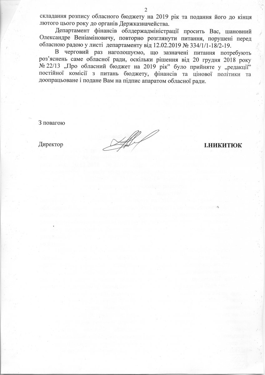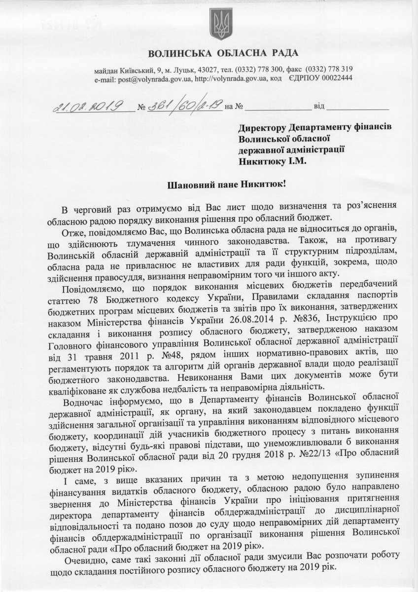 «Повідомляємо, що порядок виконання місцевих бюджетів передбачений законодавством. Невиконання Вами цих документів може бути кваліфіковане як службова недбалість та неправомірна діяльність», – йдеться в листі першого заступника голови ради.«Сподіваємося, що Вам, як багаторічному керівникові департаменту фінансів, вистачає кваліфікації та професійних знань для того, щоб, як і в минулі роки, відповідно скласти постійний розпис прийнятого радою обласного бюджету на 2019 рік.