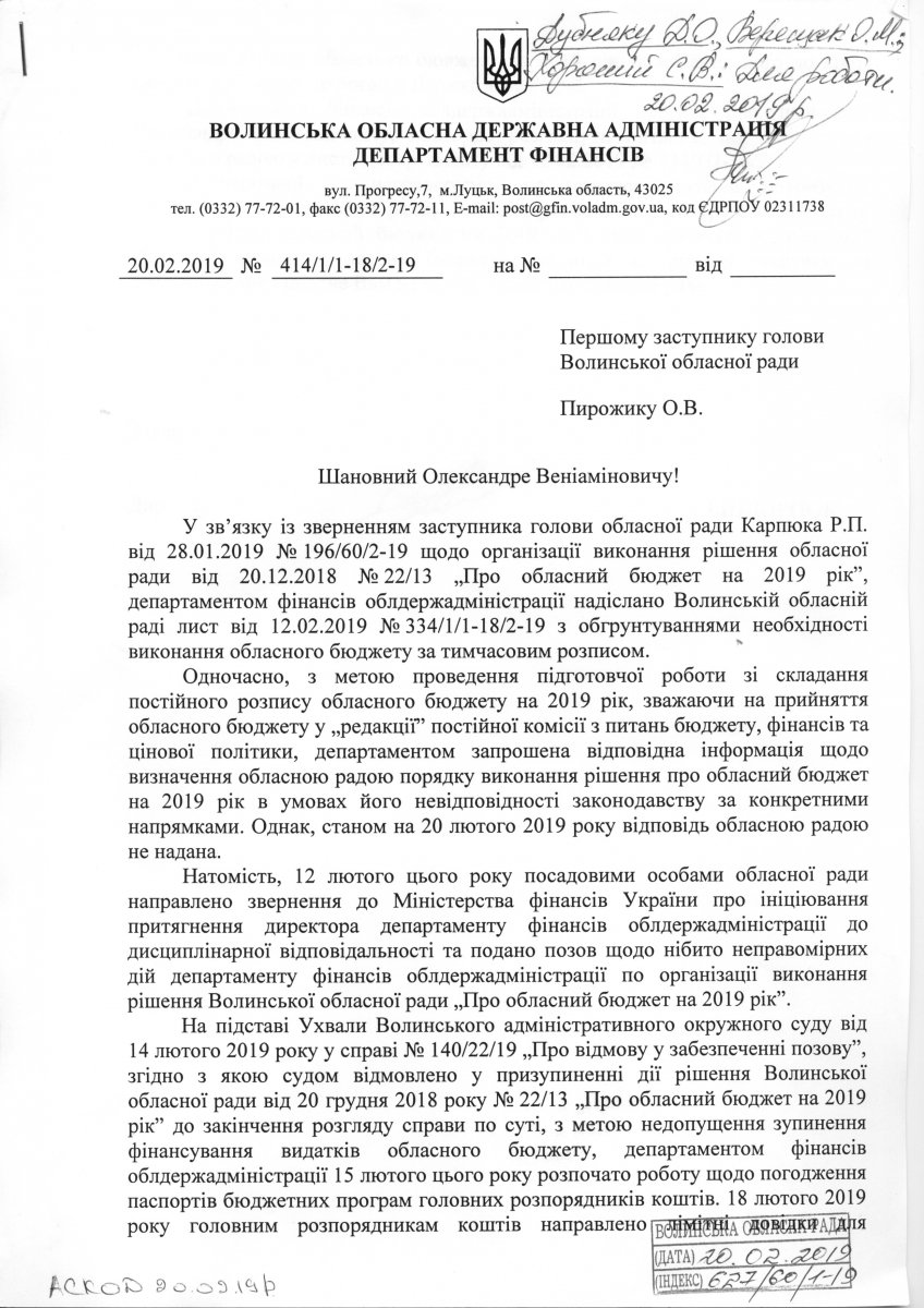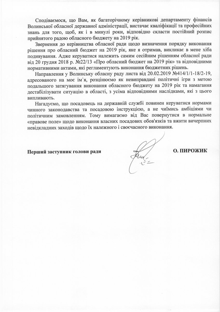 Направлення у Волинську обласну раду листа від 20.02.2019 № 414/1/1-18/2-19, адресованого на моє ім’я, розцінюємо як невиправдані політичні ігри з метою подальшого затягування виконання обласного бюджету на 2019 рік та намагання дестабілізувати ситуацію в області, з усіма відповідними наслідками, які з цього випливають», – пише Олександр Пирожик.