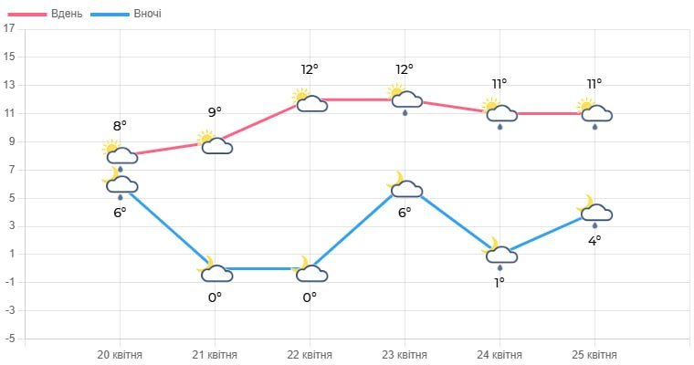Хмарна погода з проясненнями очікується 25 квітня. Невеликий, місцями помірний дощ. Вітер північно-західний, 7-12 м/с. Температура вночі становитиме 0-5° тепла, вдень – 8-13° тепла.