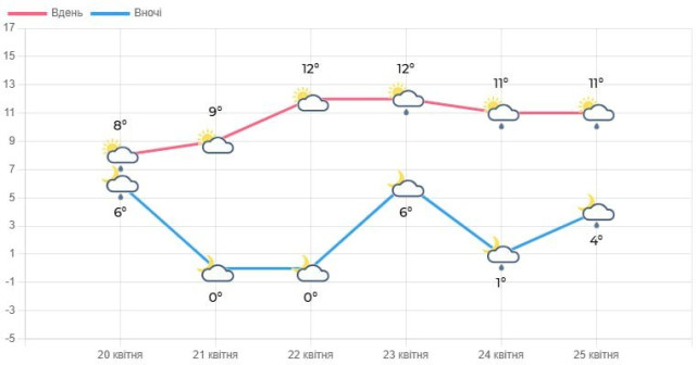 У середу, 22 квітня, прогнозують мінливу хмарність. Без опадів. Вітер північно-західний, 7-12 м/с. Вночі та вранці заморозки в повітрі 0-5° морозу, вдень – 9-14° тепла.
