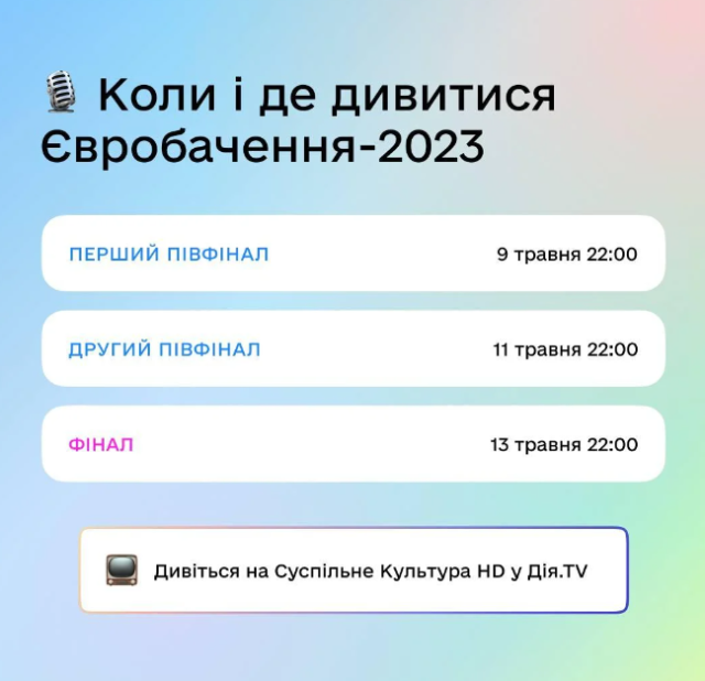 Також у «Дії» нагадали про графік Євробачення. Відомо, що перший півфінал почнеться вже 9 травня. Другий півфінал буде проходити 11 травня. Фінал Євробачення відбудеться 13 травня.