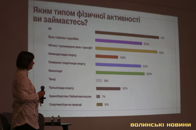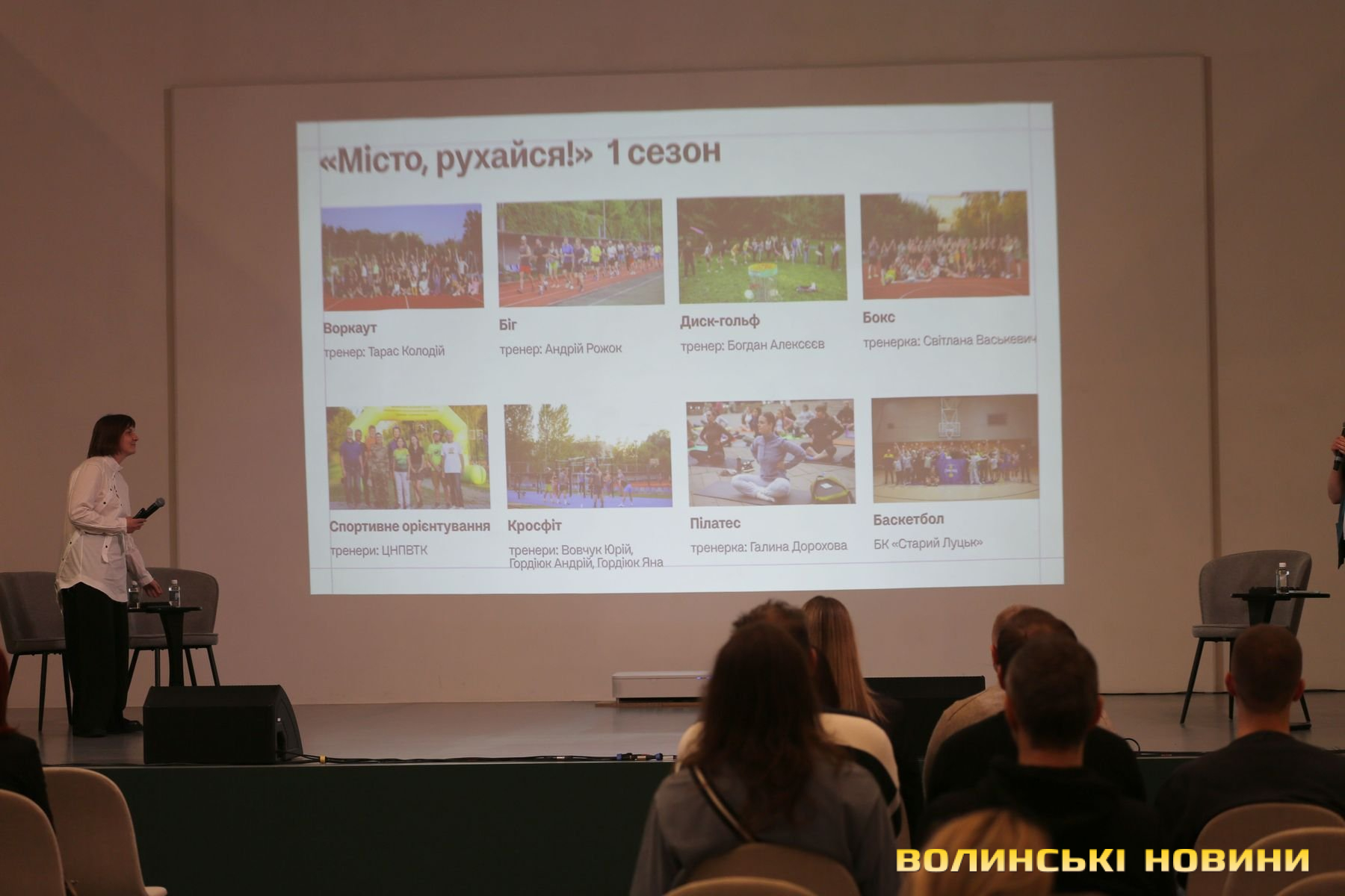 Керівниця програми Urban Vision Lutsk Лідія Гонтар і журналістка Тетяна Приймачок представили дослідження про спорту в Луцьку. Для проведення вивчали дані органів влади, опитували містян і спортивних діячів. Ще було проведено вісім відкритих тренувань для містян із різних спортивних різновидів.