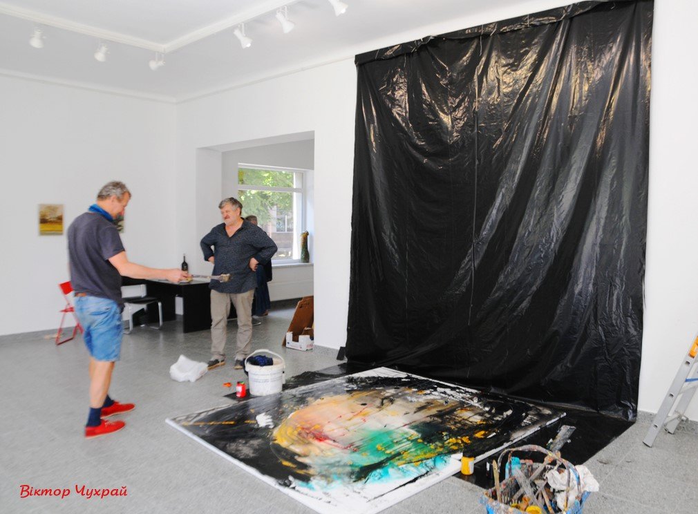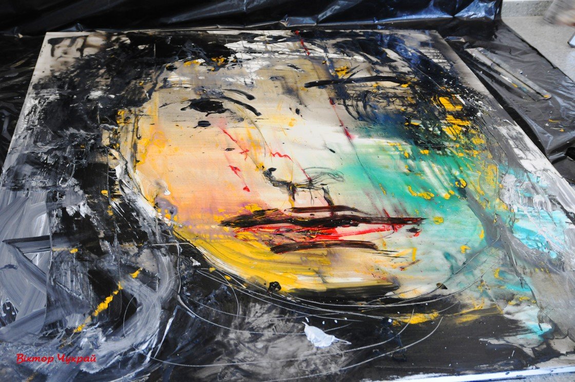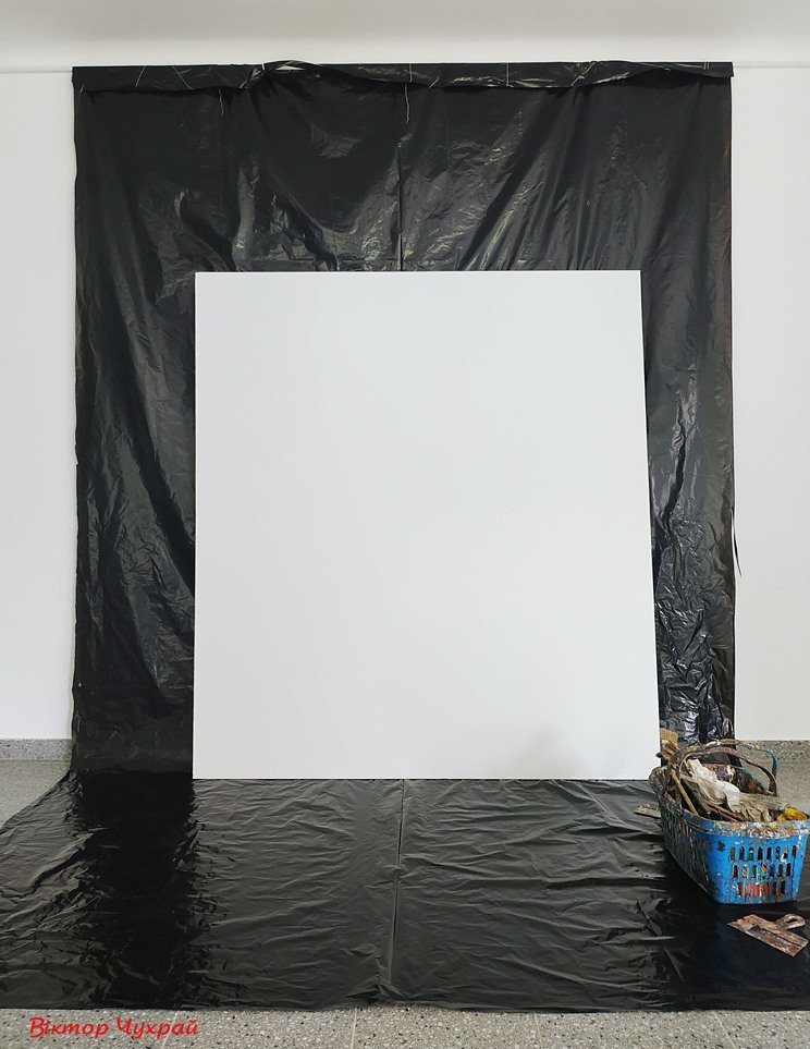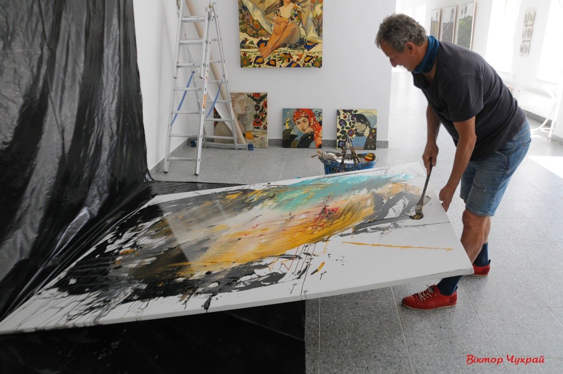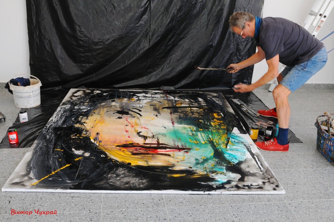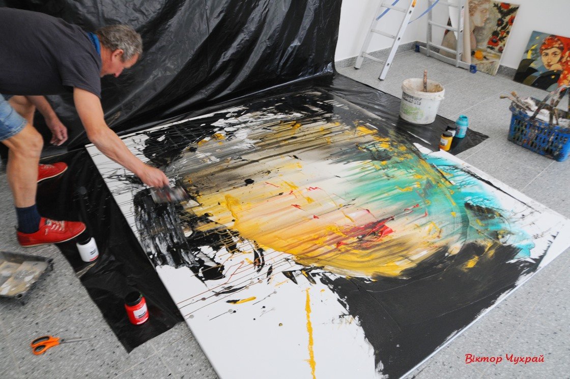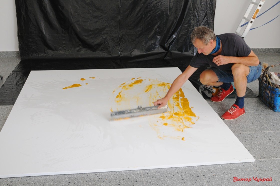 Біле полотно. Пластикове відро з водою. Шпателі. Щітки. Художник Едуард Бєльський виливає трохи води на середину полотна, яке лежить на підлозі, і неймовірно захопливе дійство творення нової картини розпочинається...