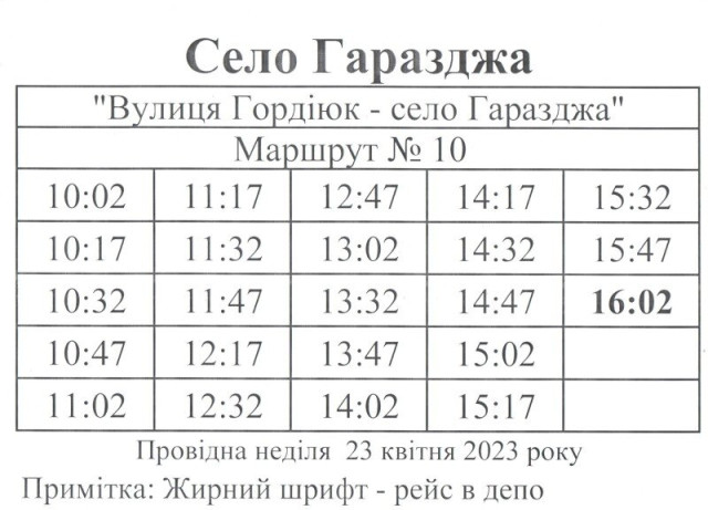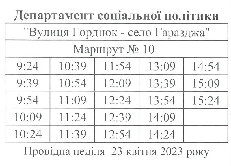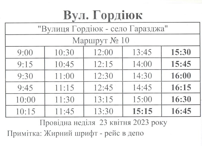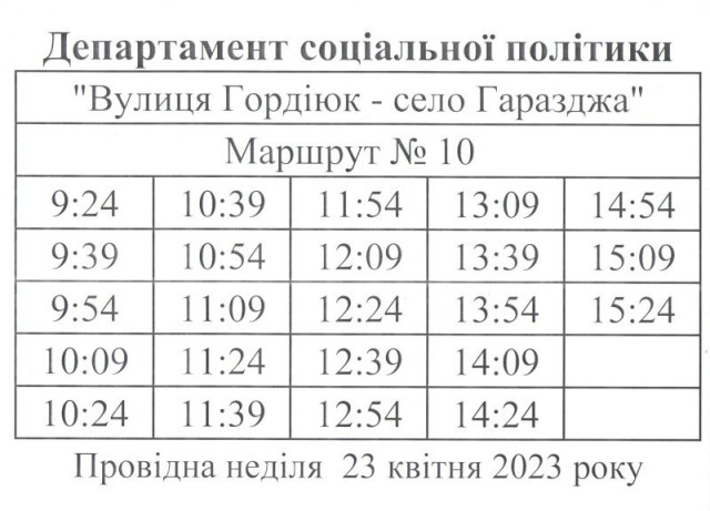 Час відправлення з зупинок «Вулиця Гордіюк», «Департамент соціальної політики», «с.Гаразджа (кладовище)» додається.Також на автобусних маршрутах № 3 «Гаразджа (кладовище) – Госпіталь» та № 10 «Карбишева (Академія рекреаційних технологій і права) – Потебні» буде збільшено кількість одиниць транспорту.