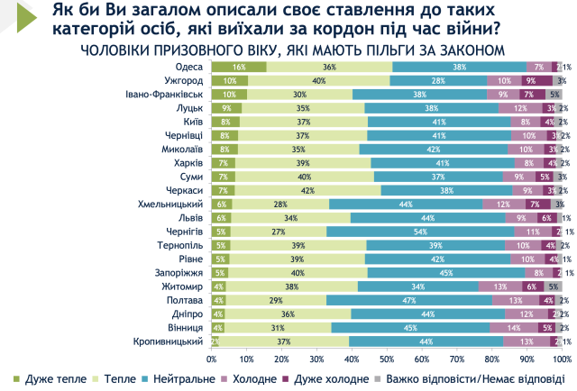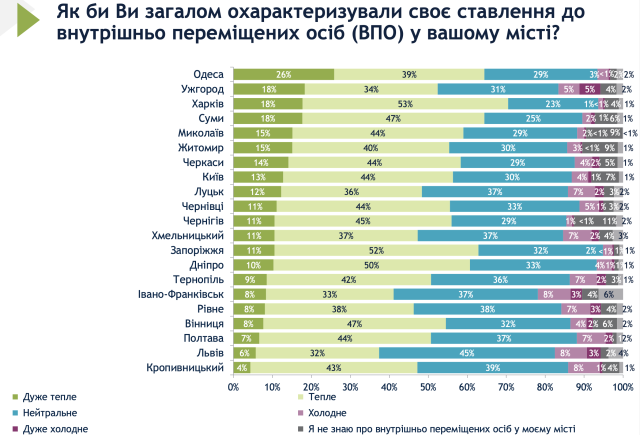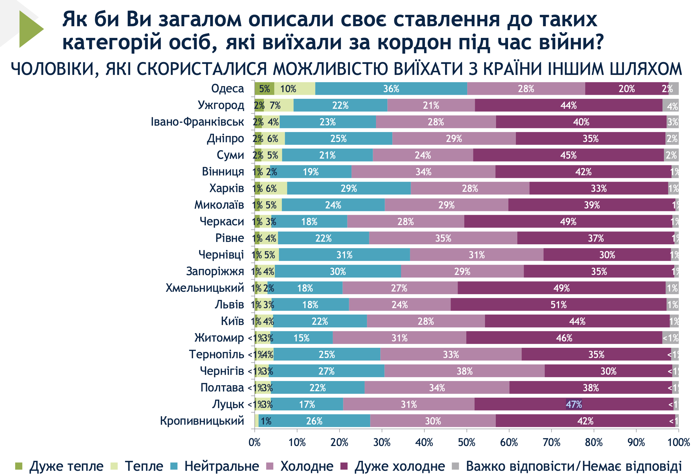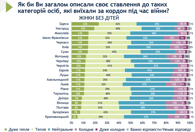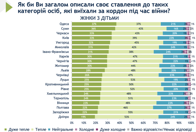 78% опитаних лучан оцінюють своє ставлення до жінок із дітьми, які виїхали за кордон, як дуже тепле або тепле. До жінок без дітей, які виїхали за кордон, так ставиться 51% респондентів. 44% позитивно ставляться теж до чоловіків призовного віку, які виїхали за кордон, бо мають пільги за законом. А до чоловіків, які скористалися можливістю виїхати з країни іншим шляхом, 78% опитаних мешканців обласного центру Волині ставляться холодно або дуже холодно.Стосовно внутрішньо переміщених осіб, які оселилися в Луцьку, то 12% містян ставляться до них дуже тепло, 36% – тепло, 37% – нейтрально, 7% – холодно, 2% – дуже холодно. 3% опитаних зазначили, що нічого не знають про переселенців у своєму місті, а 2% було важко відповісти про своє ставлення до внутрішньо переміщених осіб.Читати ще: Луцьк – найкомфортніше місто України. Результати опитування