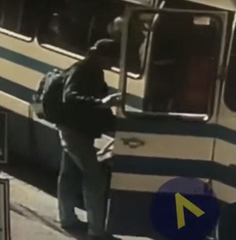 Терорист був одягнутий у довгу темну сорочку, джинси та чорну кепку. Він заходить останнім у салон автобуса та зачиняє після себе двері.