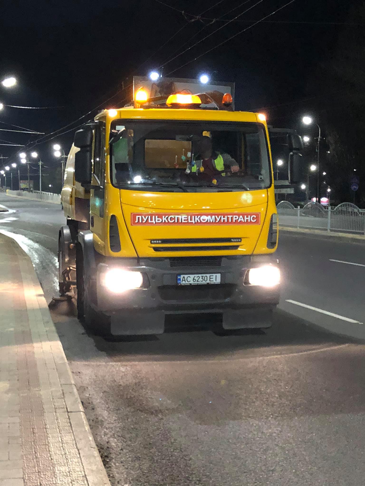 Спеціалізовані автомобілі КП «Луцькспецкомунтранс» та приватних підрядників прибирають бруд, пісок, відсів та інше сміття.