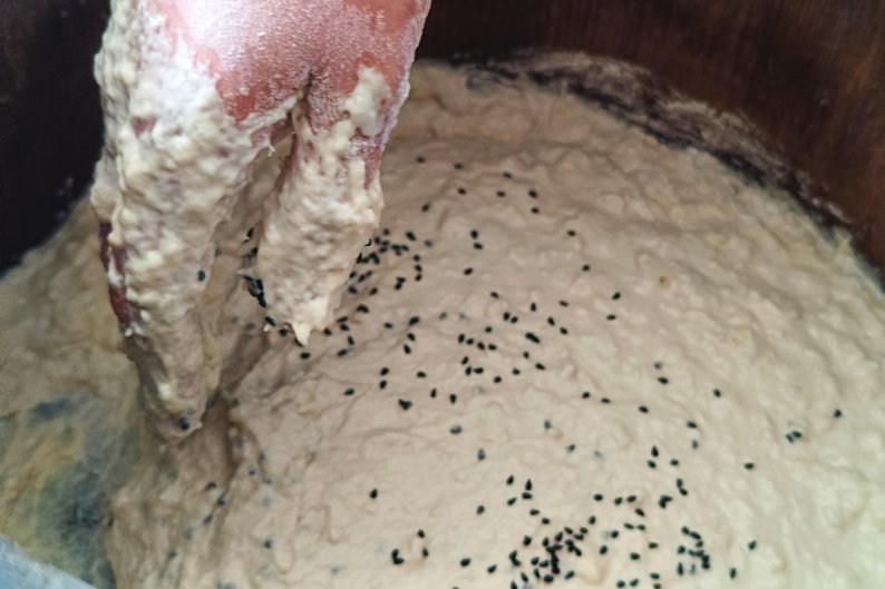 «Моя бабуся і мама з вечора готували опару або як в нас кажуть – розчину. І на ній зранку замішували тісто. Взагалі замішування тіста – це медитативний процес. Я люблю з ним працювати, а тісто любить руки», – каже господиня.Після того, як усі основні інгредієнти добре змішали, додається та сама «чорнушка». Насіння чорного кмину, зі слів Юлії, в селі вирощують.Вона ж цей інгредієнт взяла у своєї колеги – директорки Шацького будинку культури Валентини Ханзерук. Жінка розповіла, що ця рослина зовсім не вибаглива у догляді.