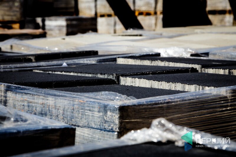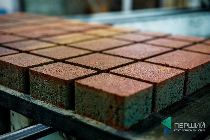 Бруківка народжується... голосно. Шумить конвеєр. Гігантські «міксери» перемішують розчин. Раз у кілька хвилин в цеху усе заглушує вібруюче «дррррррр» – це, власне, «роди»: з-під пресу з’являється конвеєр з рядами акуратних однакових «пиріжків».
