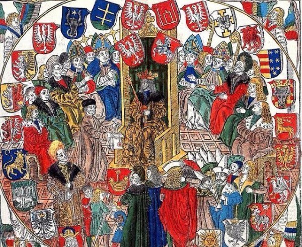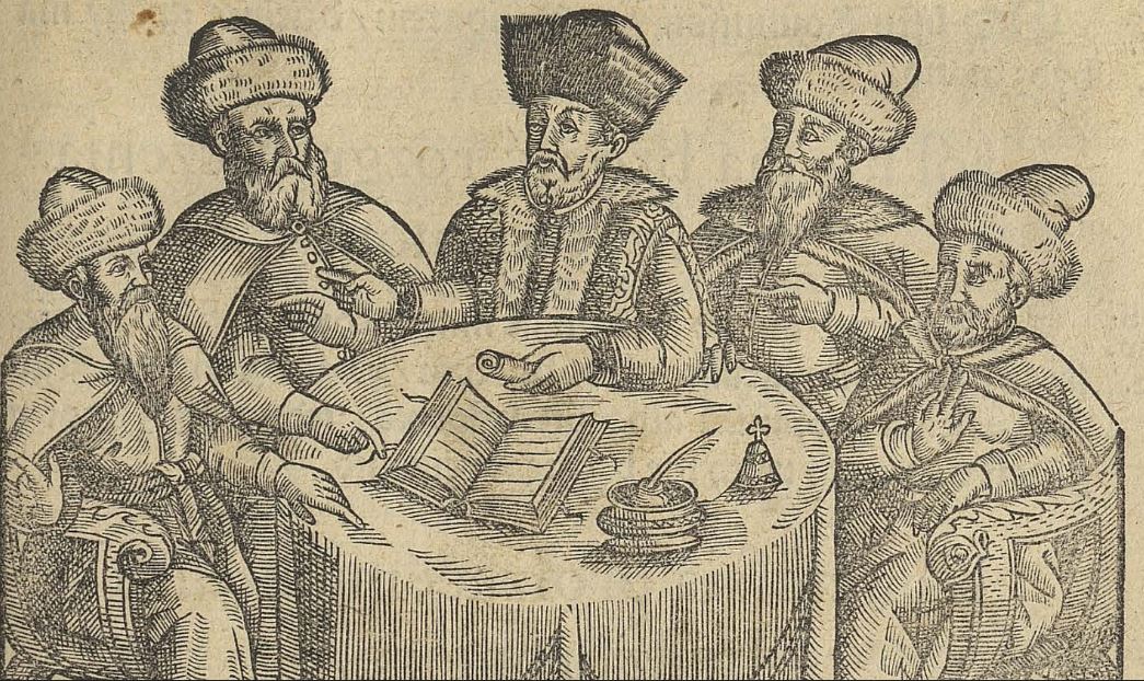 Там були королі й королеви з пишними палацами-фортецями, церемоніалом та підданими. Поважне й заможне духовенство. Святі отці та ченці, які щодень молилися і трудилися во славу Божу в церквах та монастирських обителях. Шляхтичі з шляхтянками, які у невідкладно важливих справах, а, може, за покликом закоханого серця, долали великі відстані. Їм у тому допомагали фірмани майстерно виконаних ремісниками карет-ридванів. На дорозі їх не рідко перестрівали голодні й злиденні грабіжники, якими частенько підпрацьовували «професійні» вояки-жовніри.Засідання великокнязівського сенату початку ХV століття.