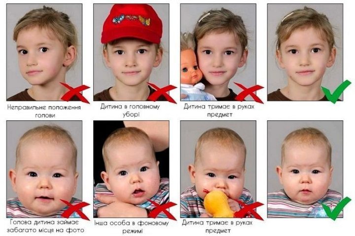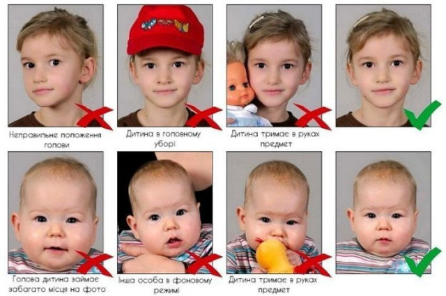 Одна кольорова фотографія розміром 10×15 сантиметрів та дві розміром 3,5×4,5 сантиметра, де 80% займає обличчя (лише у випадку, якщо батьки подають документи без дитини). Фотографії будуть відскановані і внесені на безконтактний електронний носій у паспорті;