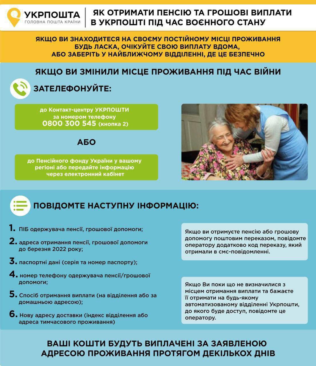 Як ідеться на Урядовому порталі, якщо ви отримували пенсії та субсидії через «Укрпошту», не виїжджали і перебуваєте на своєму постійному місці проживання, то очікуйте свою пенсію, соціальну виплату або субсидію вдома. Або ви можете забрати її у відділенні згідно зі звичайним графіком виплат від «Укрпошти».