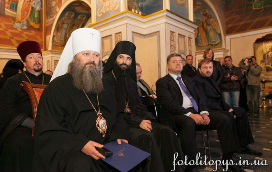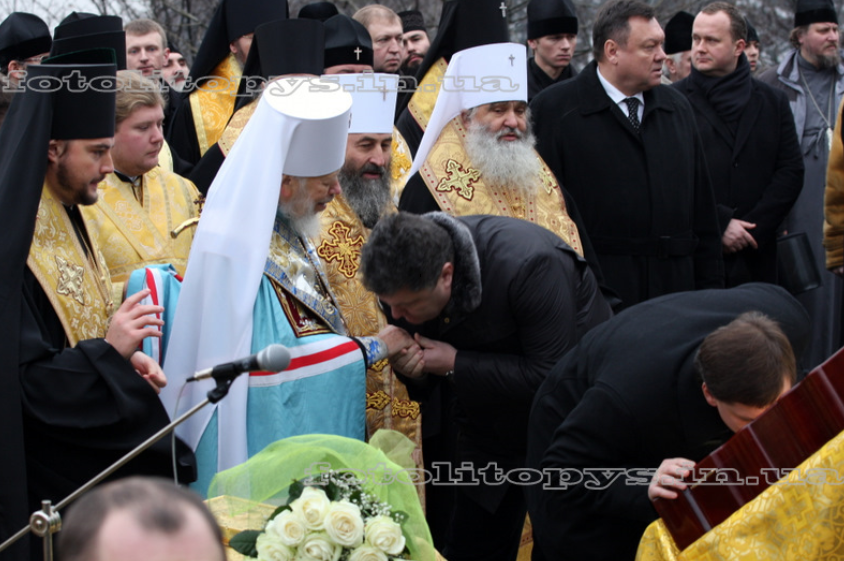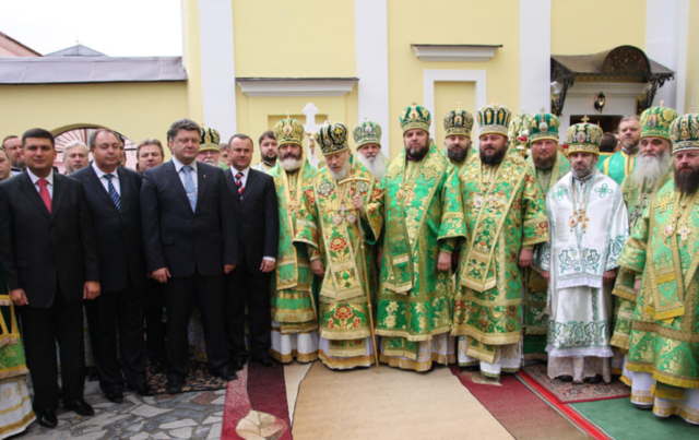 З тих пір відносини раба божого Петра з церквою нічим не затьмарювалися. При митрополиті Володимиру (Сабодану) Порошенко рідко пропускав великі церковні заходи. Ось в статусі глави української дипломатії він цілує руку главі УПЦ МП.На цьому молебні 2012 року була присутня і Юлія Тимошенко, яка приклалася до "канонічної" ікони - хоча зараз лобіює питання церковної автокефалії.На одному з церковних заходів Порошенко стоїть поруч з митрополитом Володимиром, а праворуч від нього видно Володимира Гройсмана.У 2011 році архімандрит Іона в одному з інтерв'ю згадав, що фонд Петра Порошенка - один з головних жертводавців на монастир.