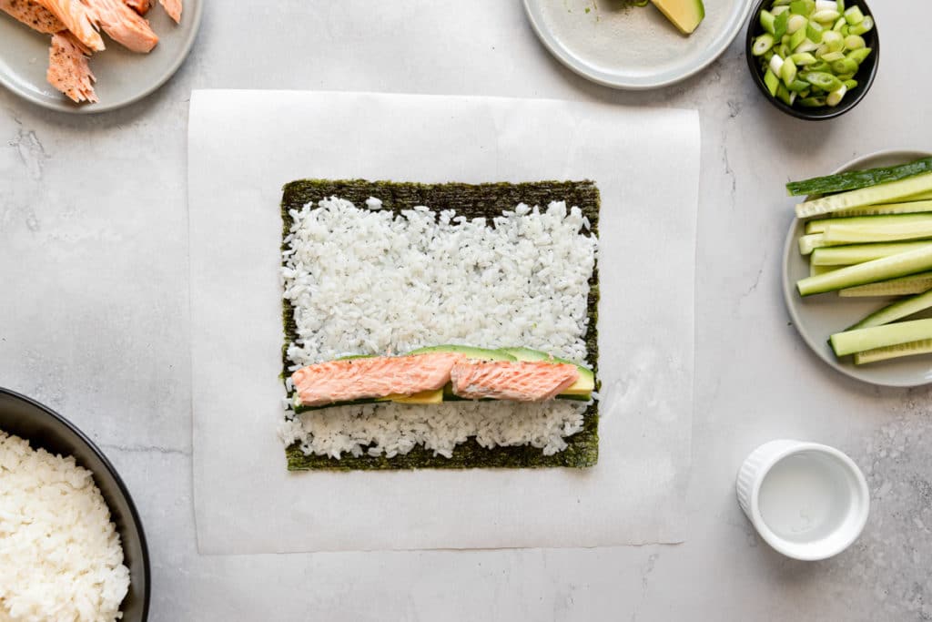 – викладіть начинку (розподіліть інгредієнти вздовж краю рису);