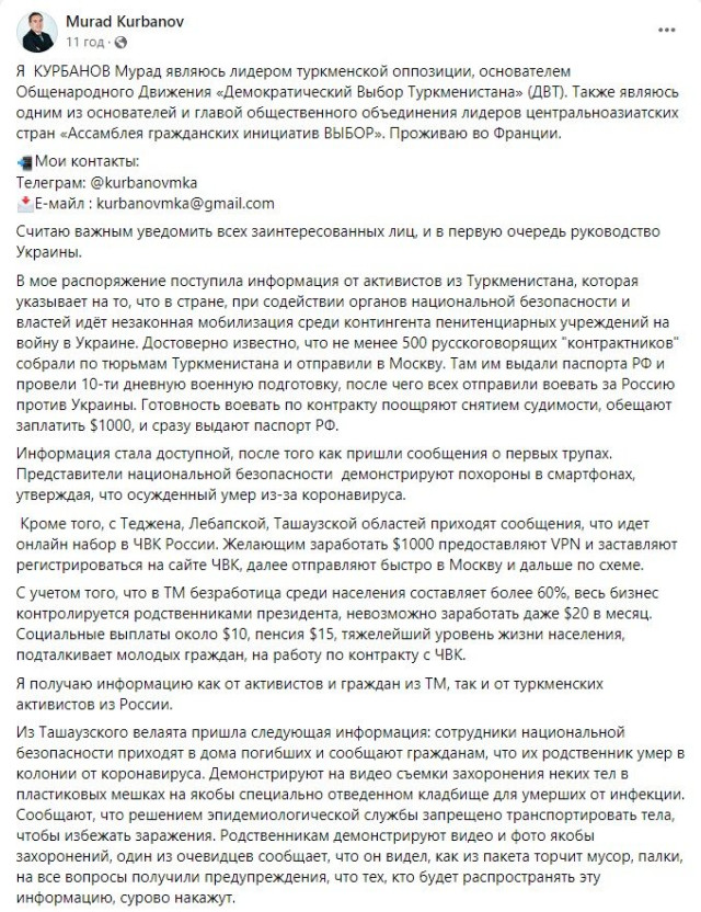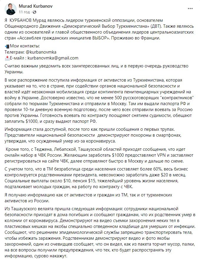 «У моє розпорядження надійшла інформація від активістів із Туркменістану, яка вказує на те, що в країні, за сприяння органів національної безпеки та влади, триває незаконна мобілізація серед контингенту пенітенціарних установ на війну в Україні. Достовірно відомо, що не менше 500 російськомовних «контрактників» зібрали у в'язницях Туркменістану і відправили до Москви. Там їм видали паспорти РФ та провели 10-денну військову підготовку, після чого всіх відправили воювати за Росію проти України. Готовність воювати за контрактом заохочують зняттям судимості, обіцяють заплатити $1000 і одразу видають паспорт РФ», – розповів він.