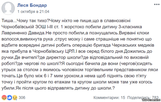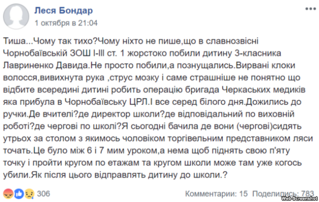 Вона додає, що після цього дочка попрохала її відпустити додому, але їй заборонили іти. Далі, зі слів Тетяни, дівчинка почала плакати, а хлопці-однокласники знімати це на телефон.