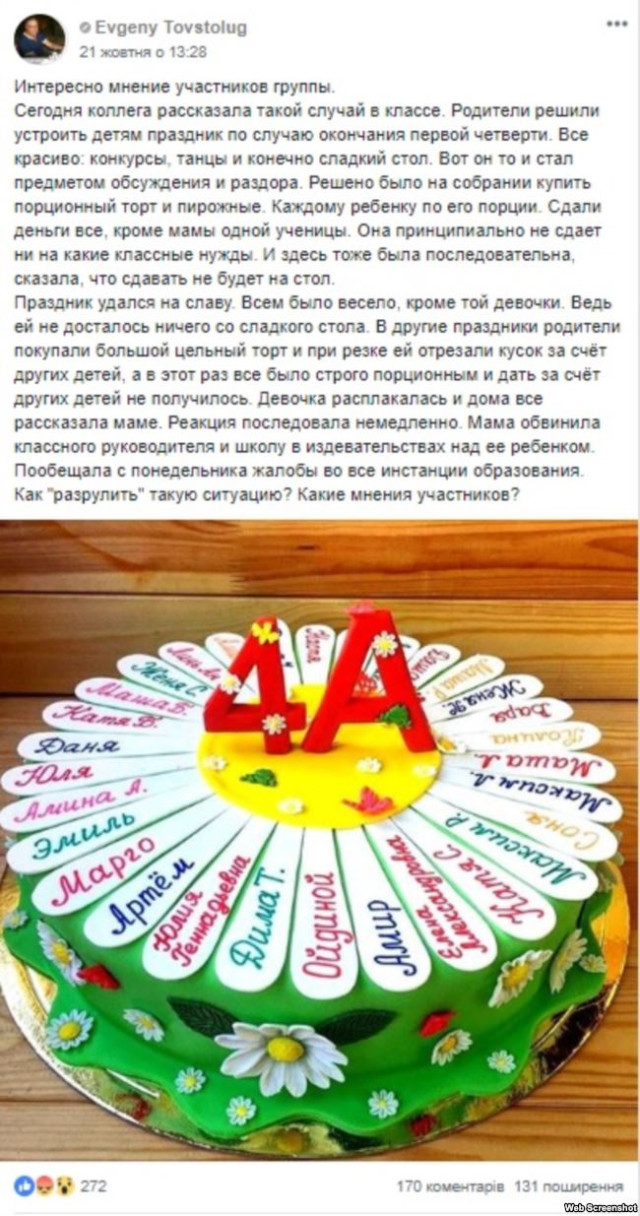 «Свято вдалося на славу. Усім було весело, крім тієї дівчинки. Адже їй не дісталося нічого з батьківського столу. Під час інших свят батьки купували великий цілий торт і під час розрізання їй відрізали шматок за рахунок інших дітей, а цього разу усе було строго порційно і дати за рахунок інших дітей не вдалося», – написав він, наголосивши, що мама цієї учениці принципово не здає грошей на жодні потреби класу, тому і цього разу до ініціативи не долучилася.Описана чоловіком ситуація викликала цілий шквал обурення. Одні почали звинувачувати у тому, що сталося, маму ображеної дитини.