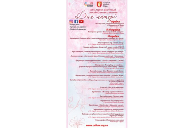Цьогоріч, враховуючи ситуацію, що склалася у зв'язку з поширенням COVID-19, галузь культури міста Луцька працює у новому форматі. Заходи, приурочені Дню матері, теж відбуватимуться онлайн.