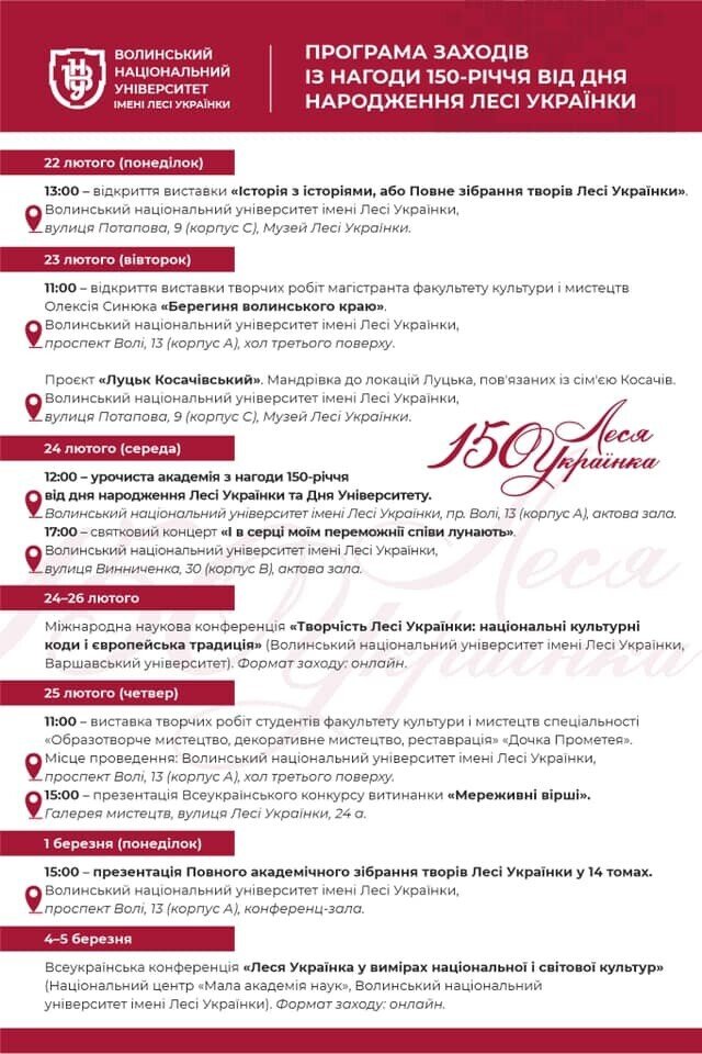 Серед запланованих заходів - виставки творчих робіт, мандрівка локаціями, пов'язаними із сім'єю Косачів у Луцьку, міжнародна наукова конференція, святковий концерт, а також презентація Повного академічного зібрання творів Лесі Українки у 14 томах.Святкові заходи розплановані на увесь лютий. Кожен охочий зможе вибрати подію на свій смак.