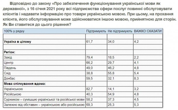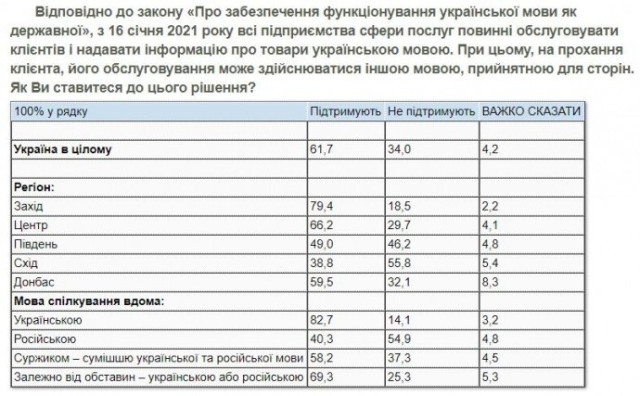 «61,7% українців підтримують чинну норму про обслуговування українською мовою. Не підтримують – 34%, а ще 4,2% не визначилися зі своєю думкою», – йдеться в повідомленні.