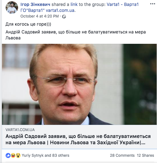 Зінкевич періодично жартує над Садовим в своїй групі і критикує міську владу.