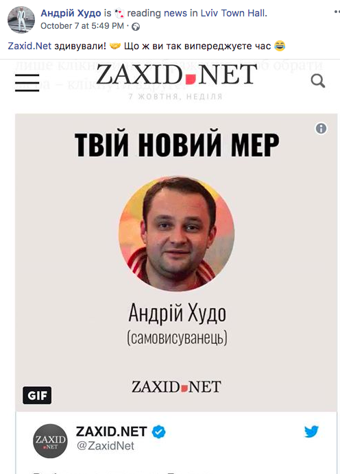 Сам Худо на своїй сторінці в "Фейсбуці" опублікував пост з жартівливим виборчим автоматом (гру, до речі, запустив сайт, що належить родині Садового - потрібно клікнути по фото можливих кандидатів і вибрати мера), де на виборах перемагає він.