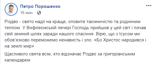 Щасливого свята всім, хто відзначає Різдво за григоріанським календарем», – написав президент України.