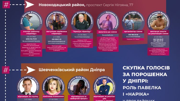 Так, за даними активістів, до сітки Порошенка в Дніпрі причетний депутат Верховної Ради Андрій Павелко – він курує всю систему підкупу виборців в місті. Також засвітився в схемі його сват Олександр Петровський, відомий як кримінальний авторитет «Нарик», він відповідає за силове прикриття сітки в Дніпрі.