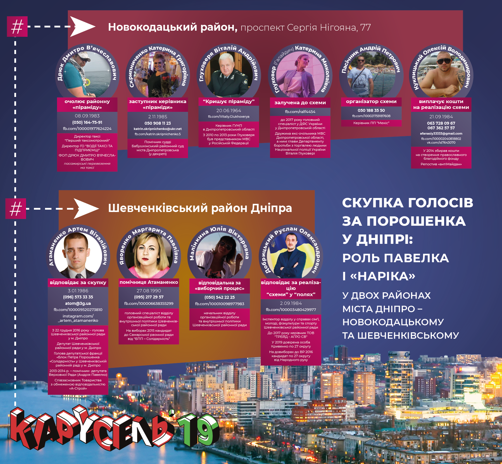 Також «Карусель-2019» стверджує, що в Новокодацькому районі (до декомунізації – Ленінському) Дніпра штаб сітки Порошенка знаходиться за адресою проспект Нігояна, 77 – у будівлі районної ради. Там районну «піраміду» очолює директор фірми таксі «Перший таксомоторний» Дмитро Дрюк, разом з ним в схемі підкупу виборців задіяна його дружина Катерина Скрипниченко – помічниця судді Бабушкінського райсуду Дніпра, яка зараз формально перебуває в декреті. Крім того, в розслідуванні стверджується, що кума Дрюка Катерина Глуховеря (Галайдіч) є дружиною екс-керівника МВС в Дніпропетровській області, а нині глави Департаменту боротьби з торгівлею людьми Національної поліції України Віталія Глуховері.