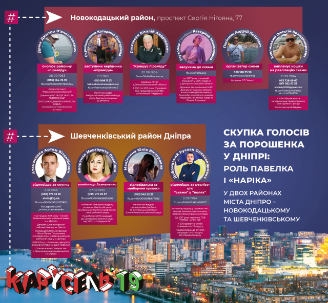 Громадський проект «Карусель-2019», який розповідає про скупку голосів на виборах президента, опублікував схему сітки Петра Порошенка в Дніпрі. Розслідування розміщено на сайті проекту.