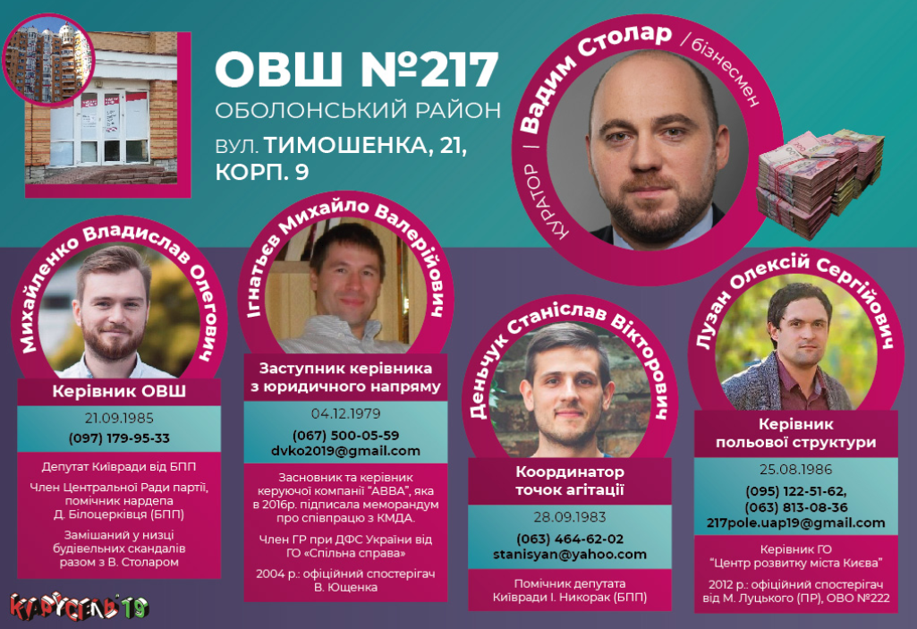 Так, сайт детально розписує структуру управління цим проектом у Києві. «Карусель-2019» стверджує, що сіткою в Києві керує відомий бізнесмен Вадим Столар – один з «смотрящих» за всім земельно-будівельним бізнесом в столиці, по суті «куратор» офіційного мера Віталія Кличка.