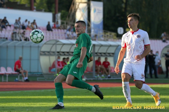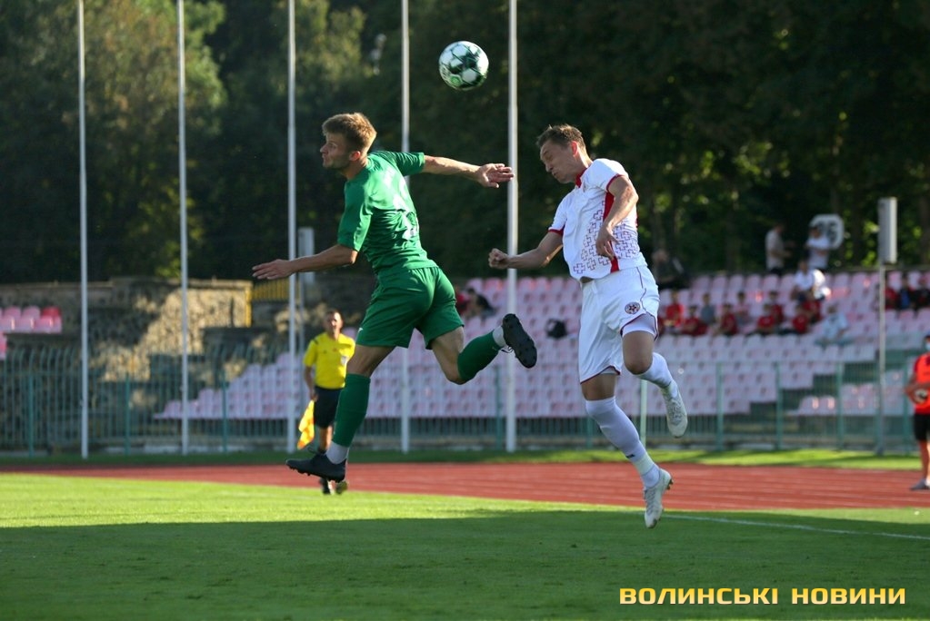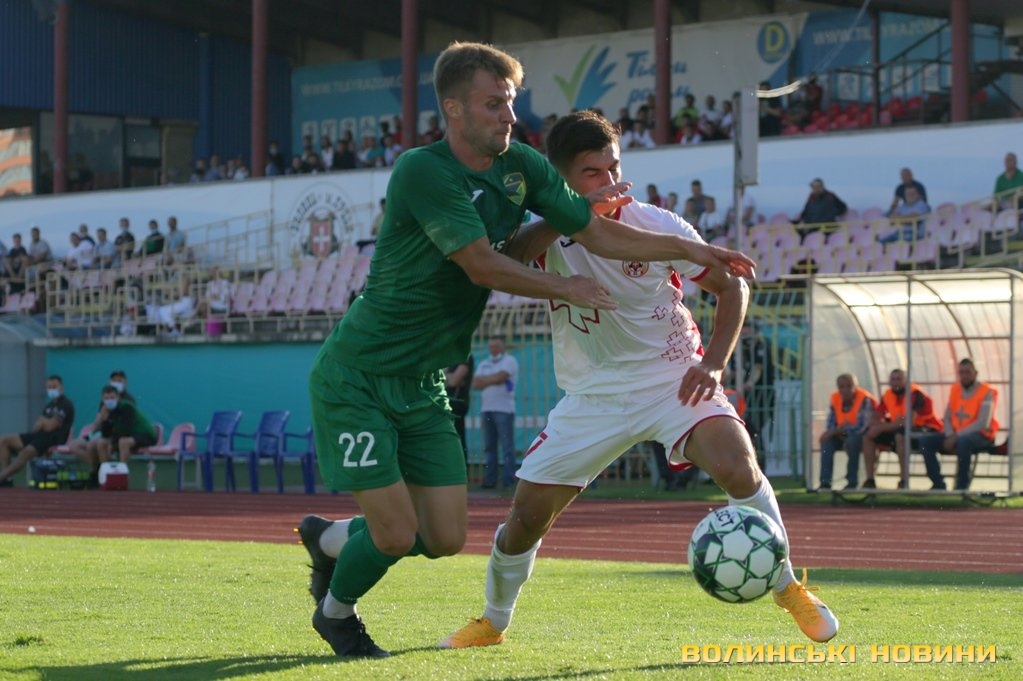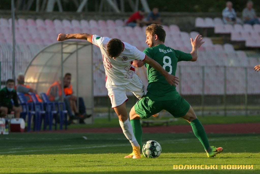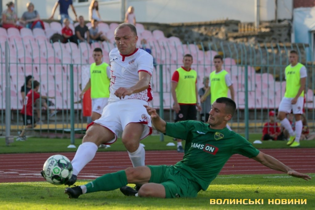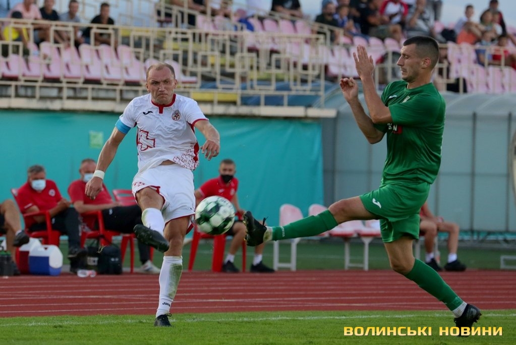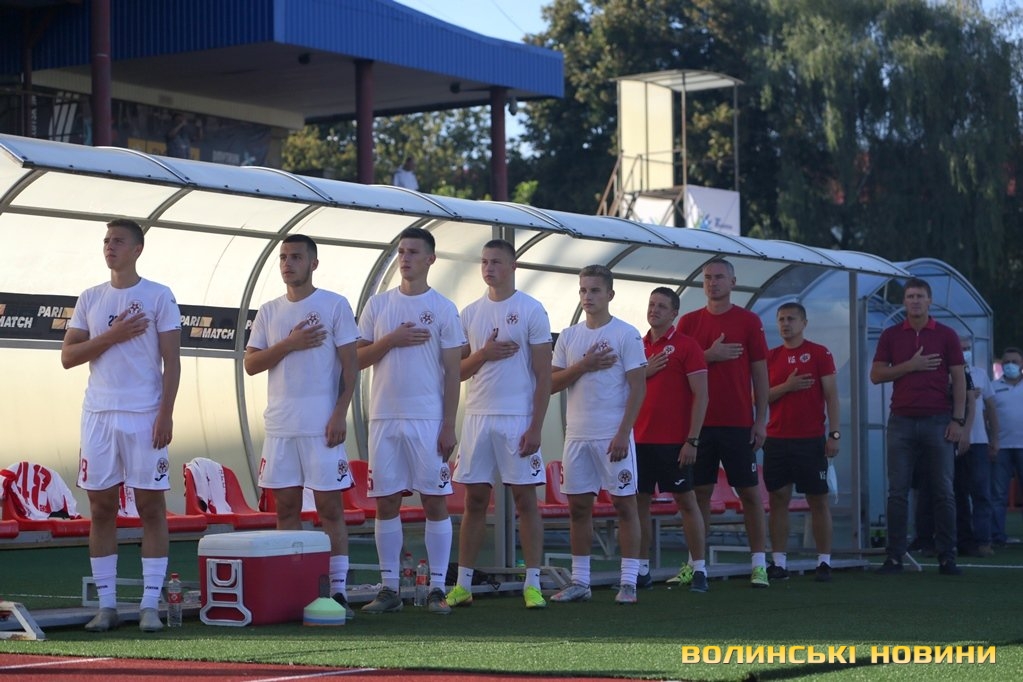 Поки «Волинь» рахувала футболістів, які зможуть зіграти в Кубку, «Прикарпаття» підсилили два «ексволиняни» Ростислав Волошинович та Ярослав Конкольняк. Цікаво, що ще раніше до прикарпатців приєднався Сергій Мелінишин, який також свого часу виступав за «Волинь». А місце на тренерському містку зайняв тренер «Волині U-19» у минулому сезоні Руслан Мостовий. Він одразу ж кинув у бій колишніх «волинян», виставивши їх у стартовому складі, щоправда, Конкольняк отримав пошкодження на передматчевй розминці, тож не вийшов у старті.Попри спалах COVID-19 в клубі, Василь Сачко також виставив доволі боєздатний склад: на чолі з каптаном Сергієм Сімініним грали Леванідов, Чачуа, Протасов та Цюпа. На лаві для запасних здебільшого була молодь з «Волині-2».Старт поєдинку виявився доволі спокійним, однак м’ячем трішки більше володіли гості. Саме івано-франківці створили перший небезпечний момент у матчі – Андрій Вацеба, замикаючи простріл партнера, влучив у стійку воріт Леванідова. Натомість «Волинь» відповіла моментом Чачуа, щоправда, він виявився не таким небезпечним, адже удар хавбека заблокували захисники.А на 29 хвилині «Прикарпаття» відкрило рахунок. Гравець прикарпатців, скидаючи головою м’яч після подачі партнера, влучив у Сергія Сімініна. Арбітр розгледів гру рукою в капітана «Волині» та вказав на одинадцять метрів. До точки підійшов Роман Барчук, який впевнено розвів Леванідова та м’яч по різних кутах.