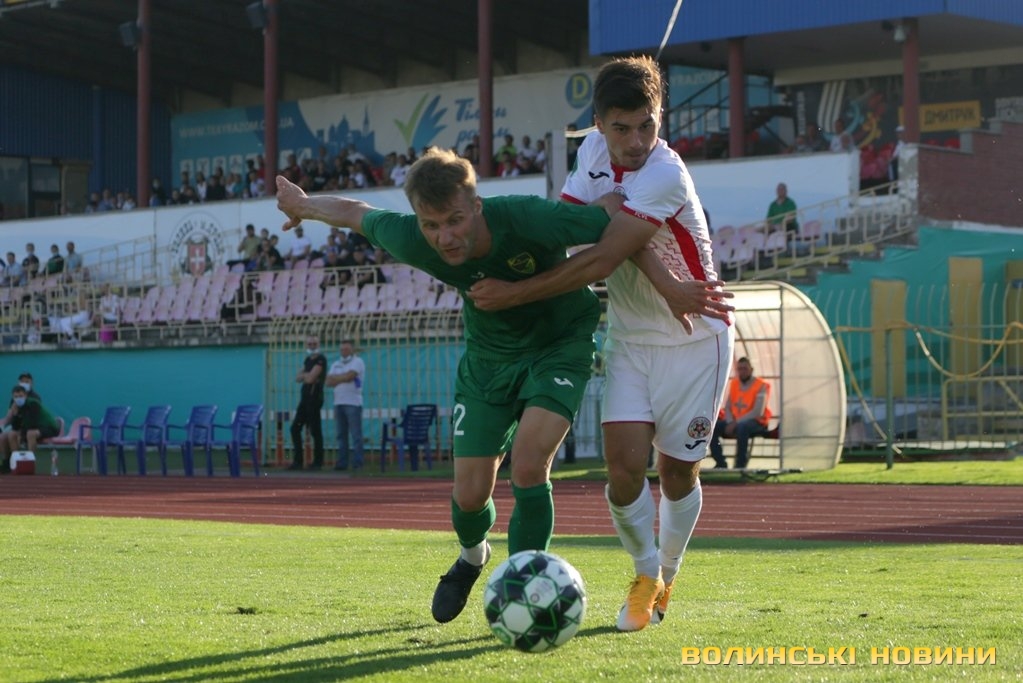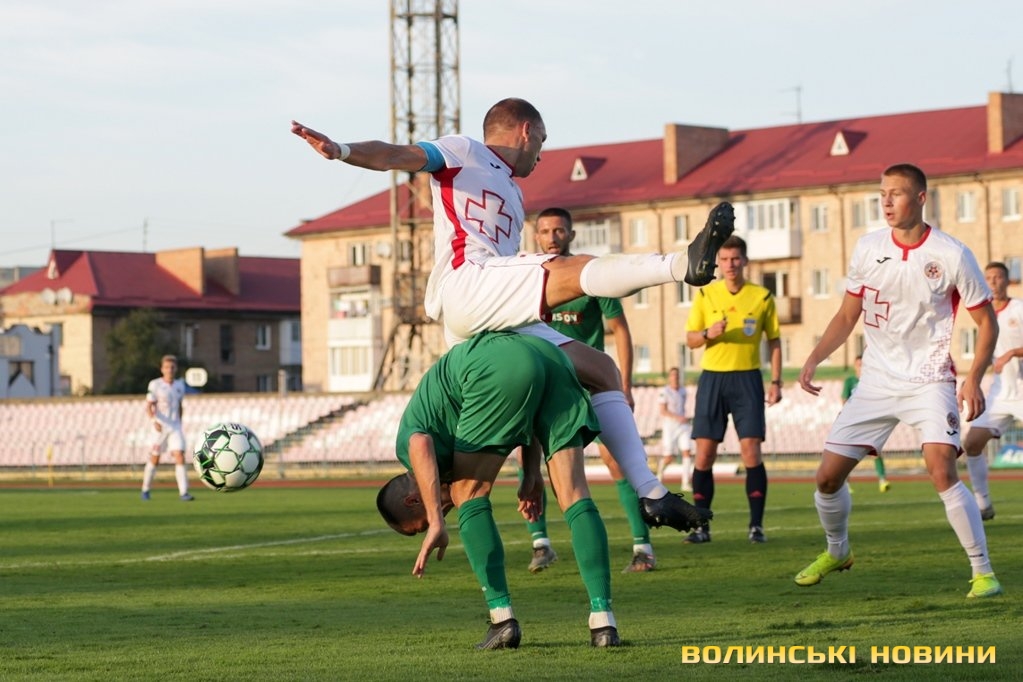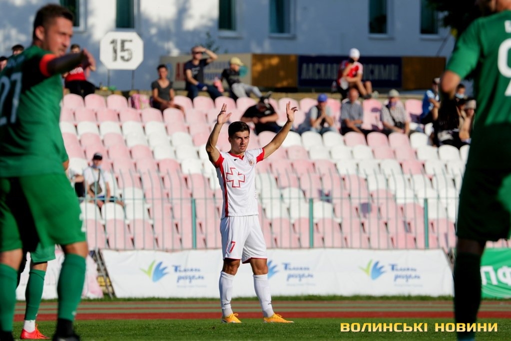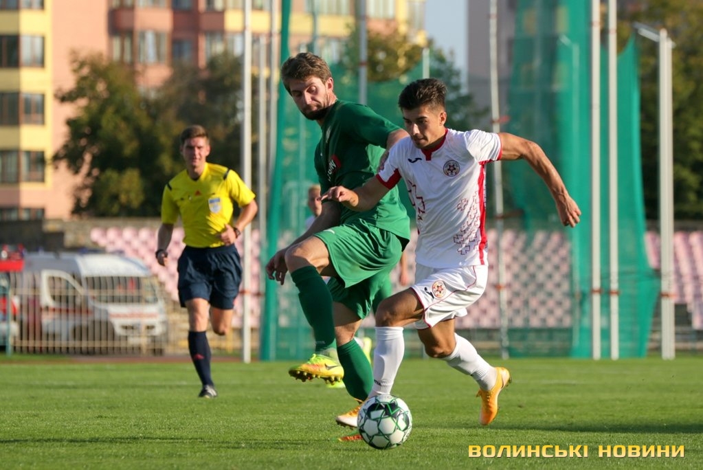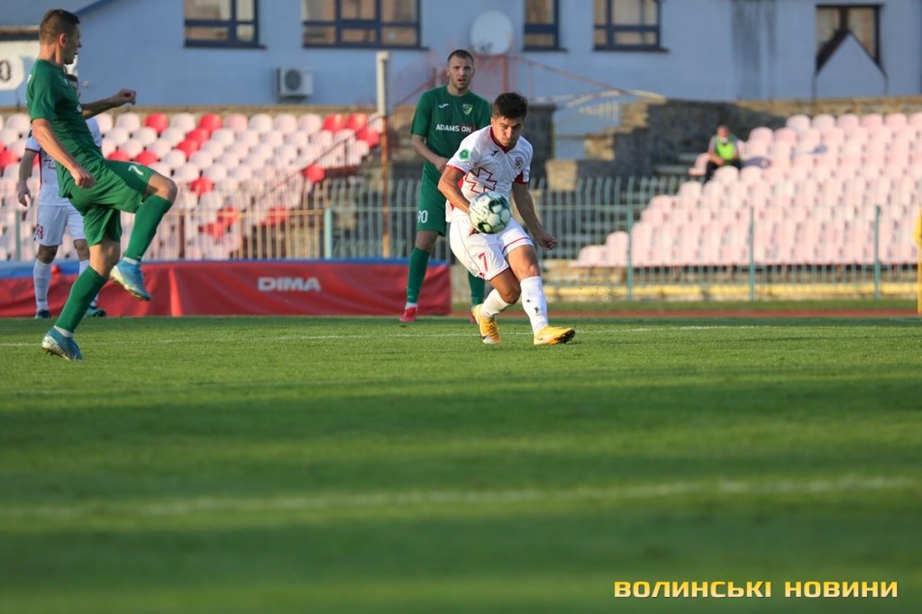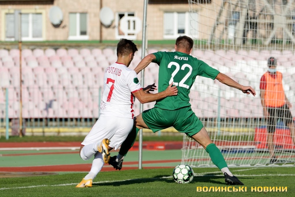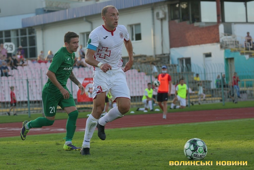 Поки «Волинь» рахувала футболістів, які зможуть зіграти в Кубку, «Прикарпаття» підсилили два «ексволиняни» Ростислав Волошинович та Ярослав Конкольняк. Цікаво, що ще раніше до прикарпатців приєднався Сергій Мелінишин, який також свого часу виступав за «Волинь». А місце на тренерському містку зайняв тренер «Волині U-19» у минулому сезоні Руслан Мостовий. Він одразу ж кинув у бій колишніх «волинян», виставивши їх у стартовому складі, щоправда, Конкольняк отримав пошкодження на передматчевй розминці, тож не вийшов у старті.Попри спалах COVID-19 в клубі, Василь Сачко також виставив доволі боєздатний склад: на чолі з каптаном Сергієм Сімініним грали Леванідов, Чачуа, Протасов та Цюпа. На лаві для запасних здебільшого була молодь з «Волині-2».Старт поєдинку виявився доволі спокійним, однак м’ячем трішки більше володіли гості. Саме івано-франківці створили перший небезпечний момент у матчі – Андрій Вацеба, замикаючи простріл партнера, влучив у стійку воріт Леванідова. Натомість «Волинь» відповіла моментом Чачуа, щоправда, він виявився не таким небезпечним, адже удар хавбека заблокували захисники.А на 29 хвилині «Прикарпаття» відкрило рахунок. Гравець прикарпатців, скидаючи головою м’яч після подачі партнера, влучив у Сергія Сімініна. Арбітр розгледів гру рукою в капітана «Волині» та вказав на одинадцять метрів. До точки підійшов Роман Барчук, який впевнено розвів Леванідова та м’яч по різних кутах.