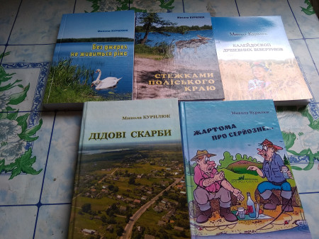 Микола Пимонович гортає сторінки своїх книг, які побачили світ упродовж 2010-2018 років: «Без джерел не живиться ріка», «Стежками поліського краю», «Калейдоскоп душевних візерунків», «Дідові скарби» та «Жартома про серйозне», а ще – збірники «На берегах Вижівки», «Коли душі торкнеться слово», захоплено розповідає про книгу «Струни душі», де зібрано твори поетів-початківців з Дубечного: