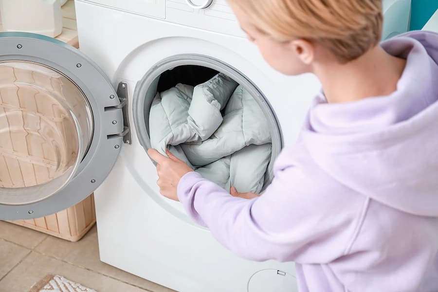 Помістіть пуховик у барабан пральної машини так, щоб він рівномірно розподілився на його поверхні.