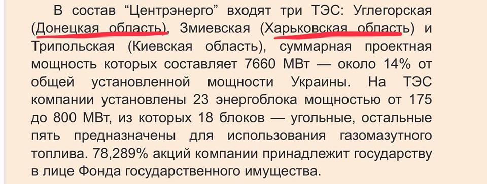 «Компанія складається з 3 ТЕС: Трипільської (Київська обл), Зміївскої (Харківська обл), Вуглегірської (Донецька обл).