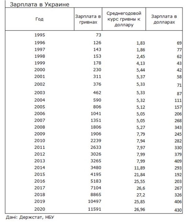 Розрахунки показують, що середня зарплата за 25 років зросла в 6,2 раза – з 69 до 430 доларів.
