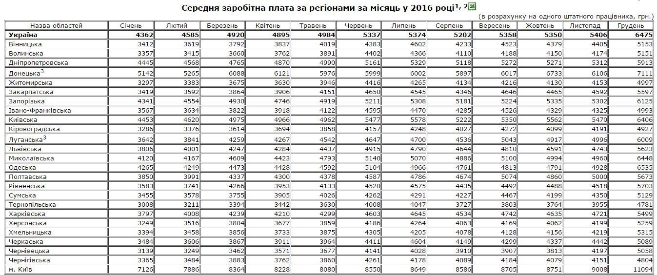 Середня зарплата в регіонах України в 2016 році. Натисність на фото для збільшення
