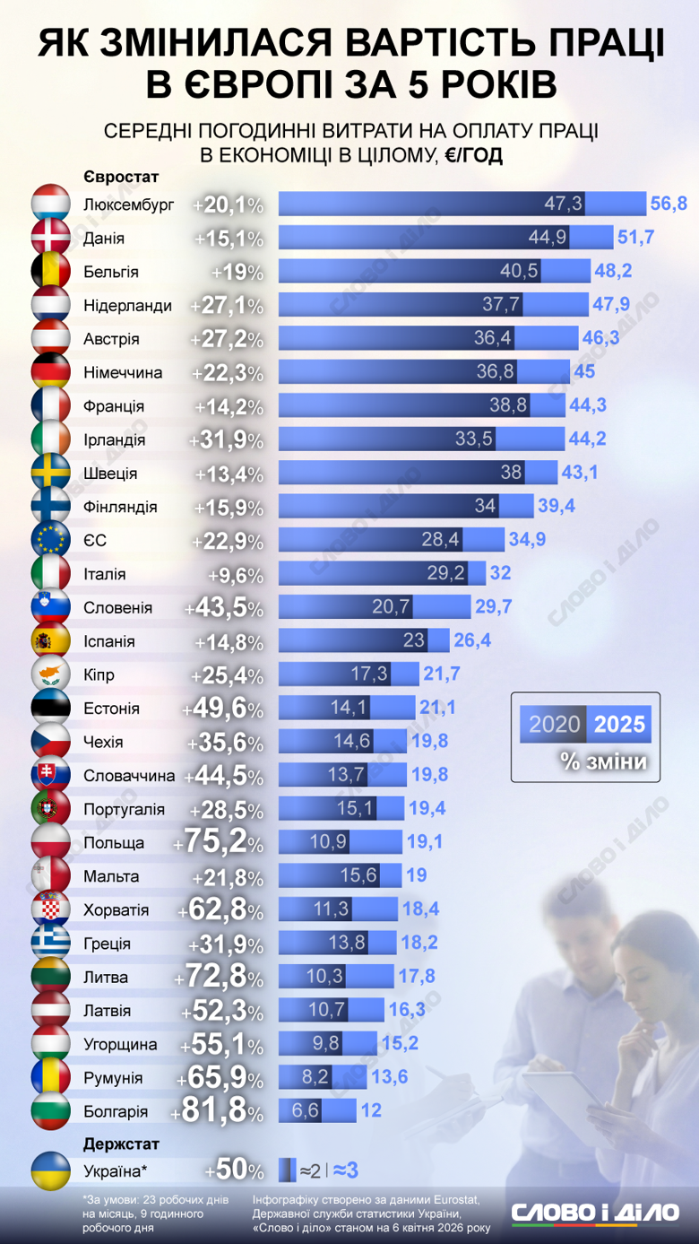 «Слово і діло» проаналізувало, як змінились середні погодинні витрати на оплату праці в країнах ЄС та Україні з 2020 по 2025 роки.