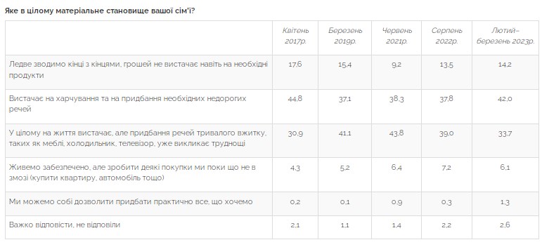 При цьому статистично значуще не змінилася сукупна частка тих, хто відповів «живемо забезпечено, але зробити деякі покупки ми поки що не в змозі (купити квартиру, автомобіль тощо)» та «ми можемо собі дозволити придбати практично все, що хочемо» (відповідно 7,5% і 7%).Опитування проводилося Центром Разумкова з 22 лютого по 1 березня 2023 року серед 2020 респондентів. Опитування проводилося лише на тих територіях, що контролюються урядом України та на яких не ведуться бойові дії. Теоретична похибка вибірки не перевищує 2,3%.