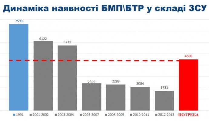 Відповідно до інфографіки, танків, бронетранспортерів і бойових машин піхоти у ЗСУ бракувало ще з 2005 року, а з 2010 року їх недоставало ще більше.