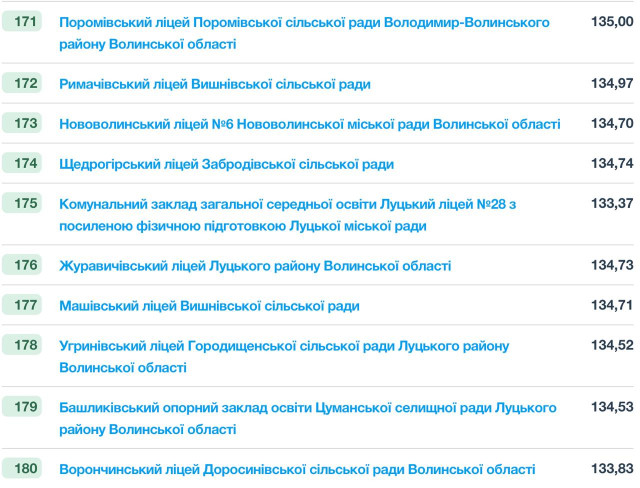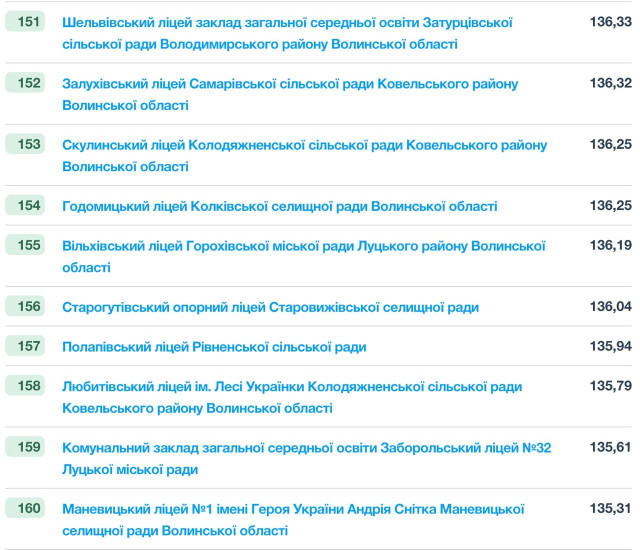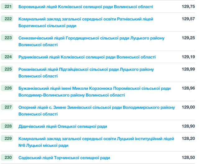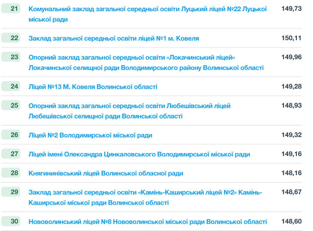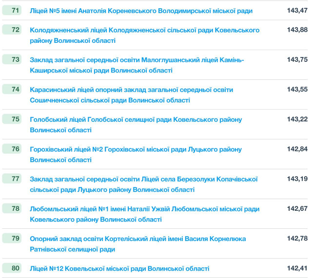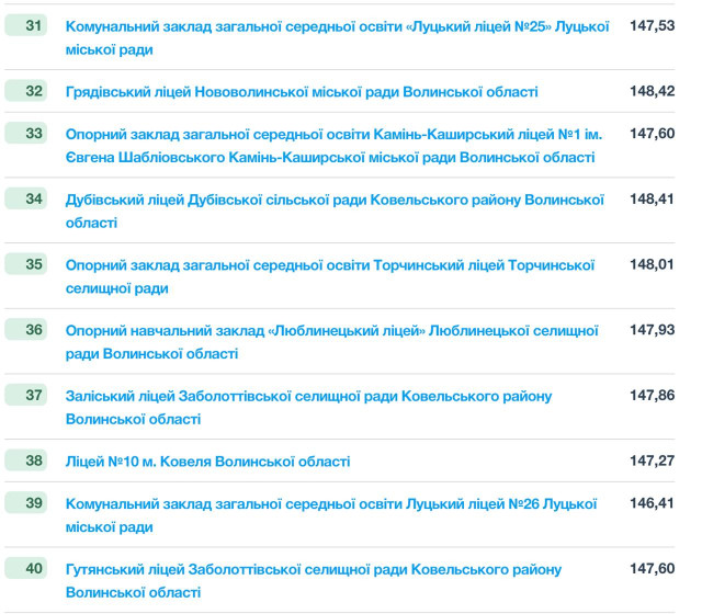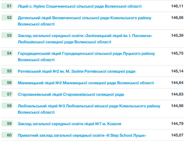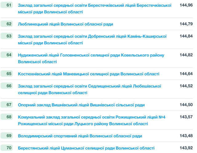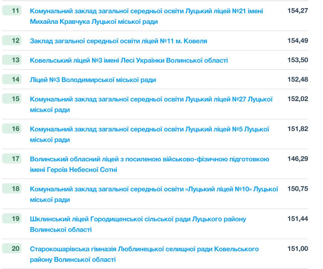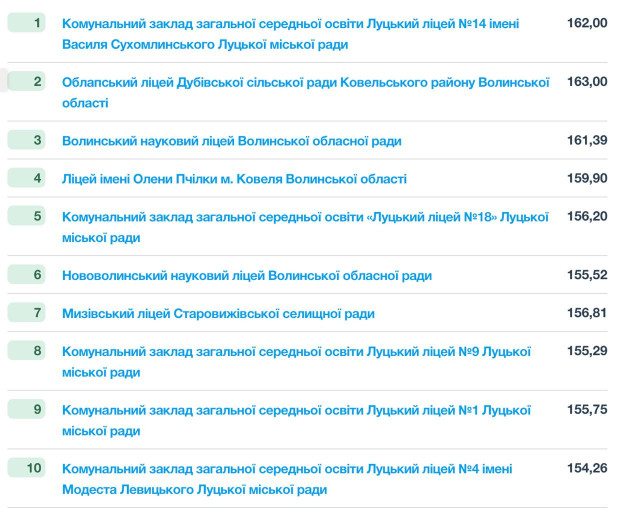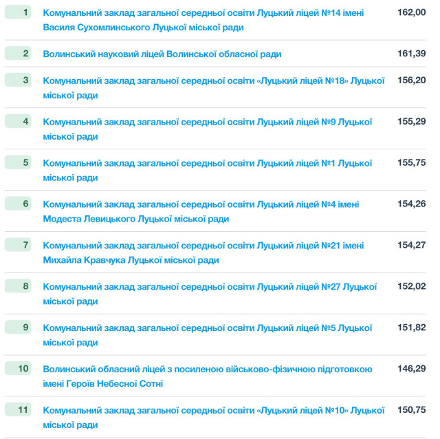 У Луцьку до першої п’ятірки, крім ліцею №14 імені Василя Сухомлинського та Волинського наукового ліцею Волинської обласної ради, які посіли перше та друге місця відповідно, увійшли ще Луцький ліцей №18 (третє місце – 156,2 бала), Луцький ліцей №9 (четверте місце – 155,29 бала) та Луцький ліцей №1 (п’яте місце – 155,75 бала).