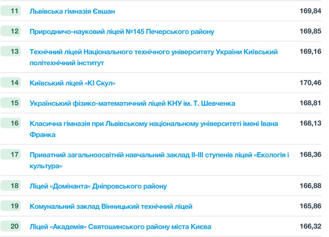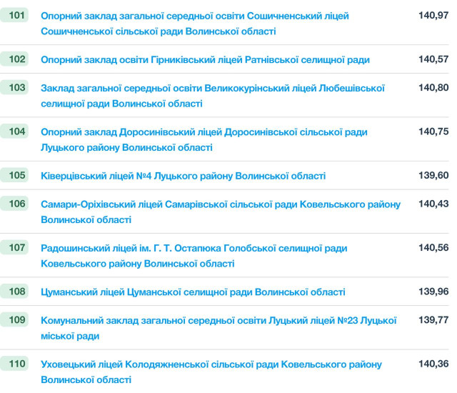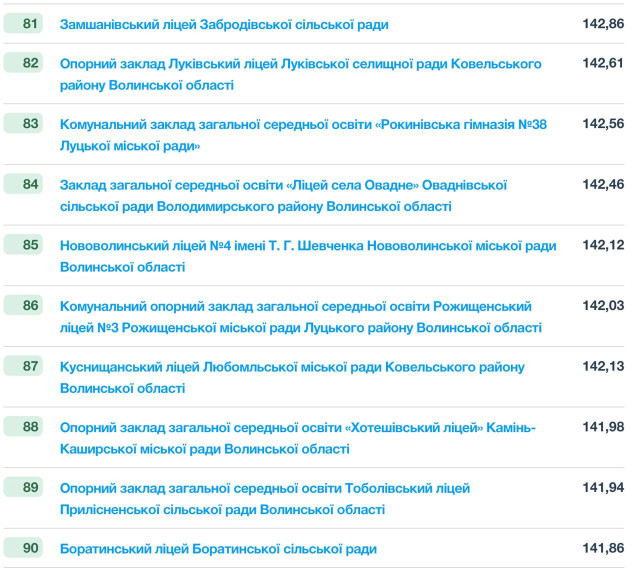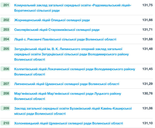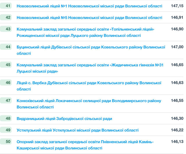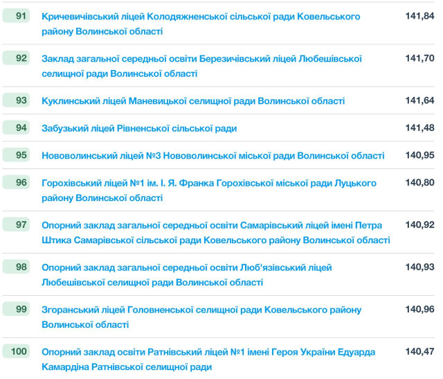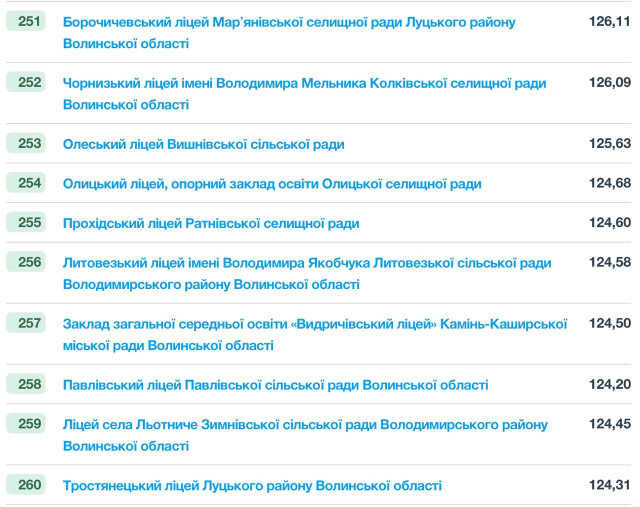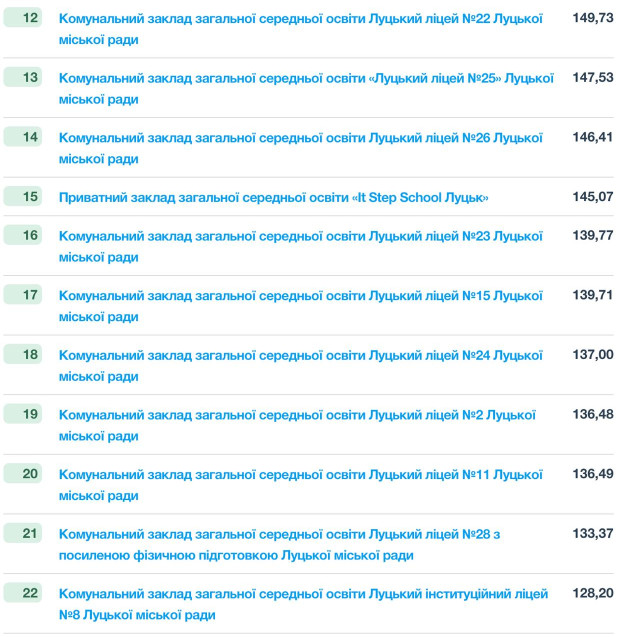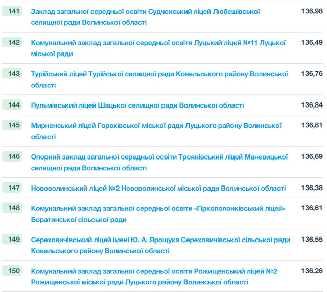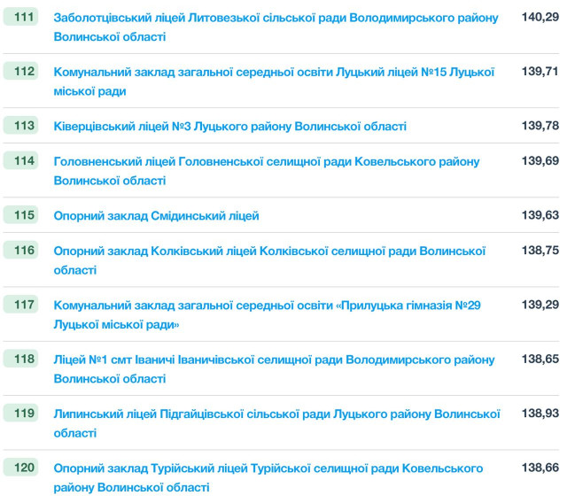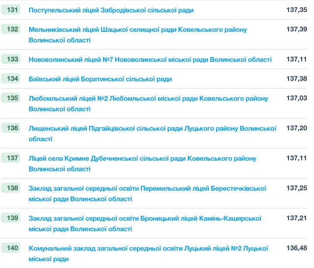 У Луцьку до першої п’ятірки, крім ліцею №14 імені Василя Сухомлинського та Волинського наукового ліцею Волинської обласної ради, які посіли перше та друге місця відповідно, увійшли ще Луцький ліцей №18 (третє місце – 156,2 бала), Луцький ліцей №9 (четверте місце – 155,29 бала) та Луцький ліцей №1 (п’яте місце – 155,75 бала).