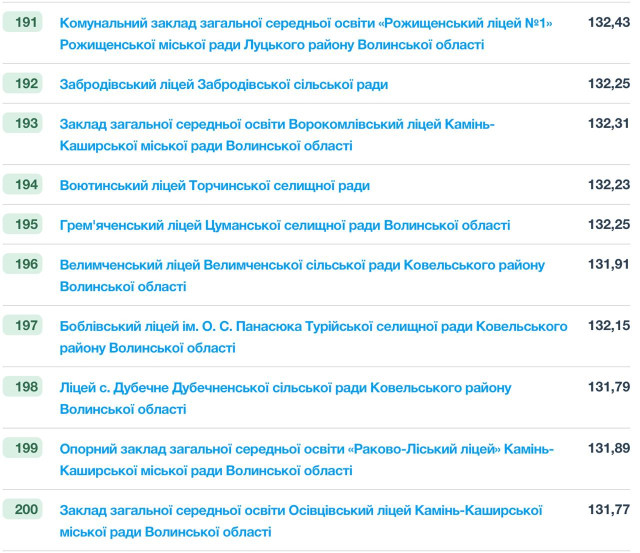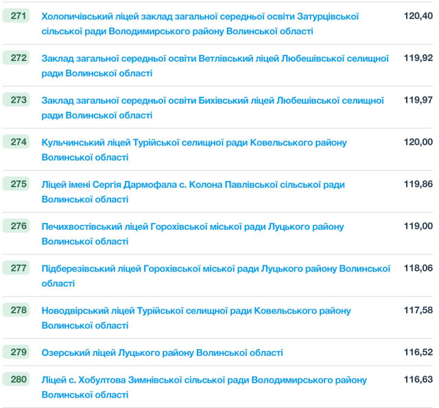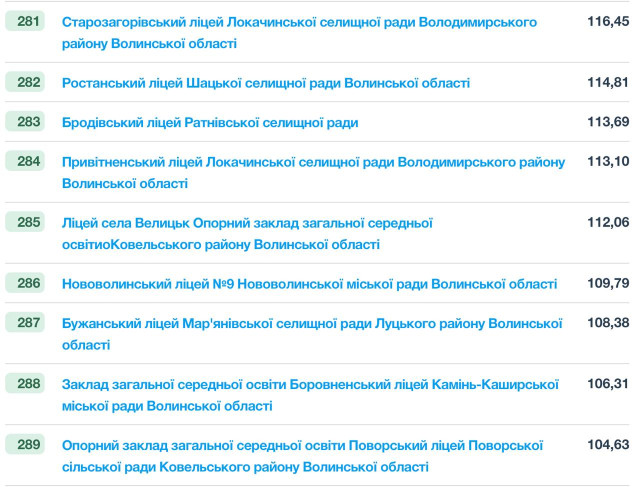 У рейтингу представлено 6561 школу, зокрема 289 шкіл Волинської області.