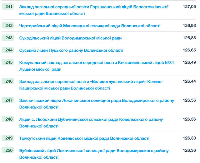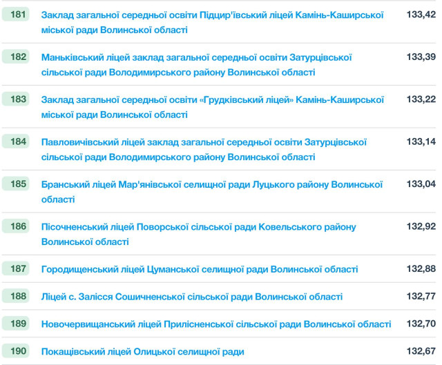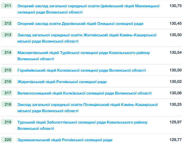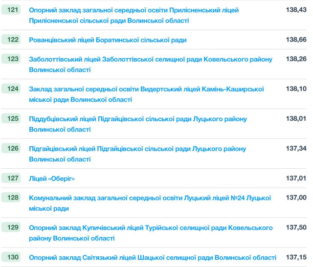 На останній позиції серед оцінюваних шкіл розташувався Луцький інституційний ліцей №8 із середнім балом випускника на НМТ 2025 – 128, 20.