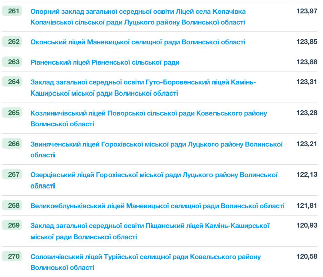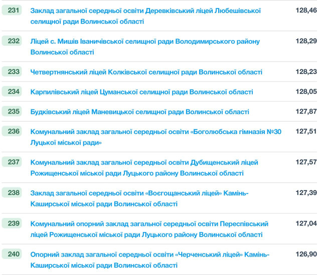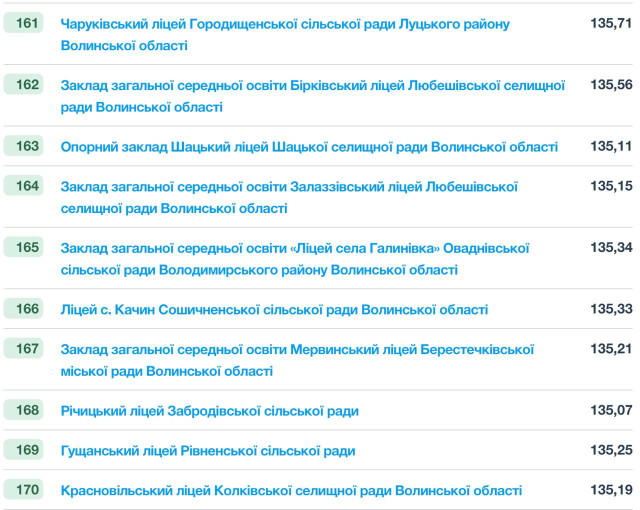 Натомість найгірший показник серед оцінюваних волинських шкіл зафіксовано у випадку Опорного закладу загальної середньої освіти «Поворський ліцей Поворської сільської ради Ковельського району». Середній бал випускника там – 104,63.