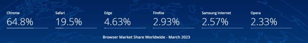 На діаграмі видно, наскільки сильно браузер Google випереджає будь-який інший браузер на всіх платформах разом узятих. Станом на березень 2023 року, Chrome займає 64,8% ринку.