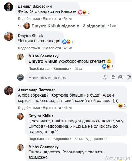 В коментарях українці обурені побаченим: «Які дивні велосипеди!», «А хіба збрехав? «Кортежів більше не буде». А цей кортеж і не більше, він такий самий як й раніше», - пишуть в коментарях українці. Також люди жартують, що це «весілля на Кавказі».