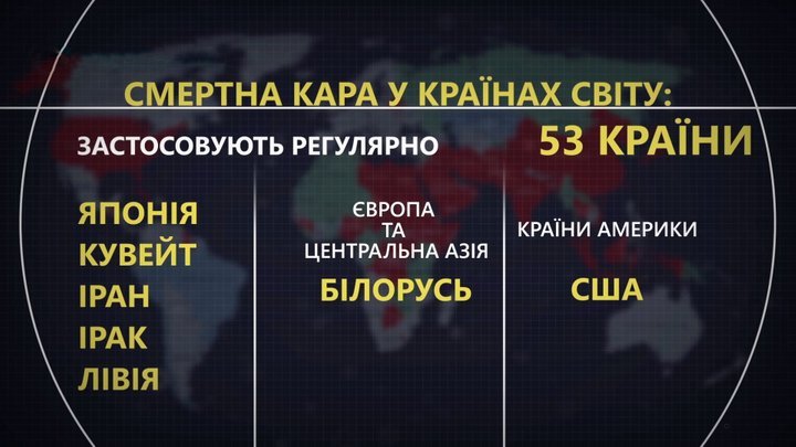 Майже 40 країн використовують тільки у вкрай тяжких злочинах. Але є приблизно 50 держав, у яких смертна кара – це те саме, що довічне ув'язнення: Японія, Кувейт, Іран, Ірак та Лівія. Серед країн Європи та Центральної Азії – страчують у Білорусі. А от в країнах Америки – у США.Де регулярно застосовують смертну кару